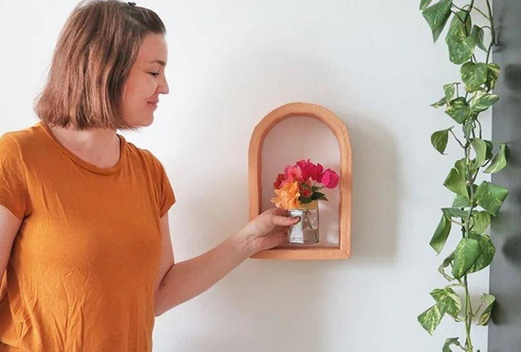 На такую полку лучше ставить какие-то легкие предметы декора. Это может быть, к примеру, небольшая вазочка с бумажными цветами, сделанными своими руками.