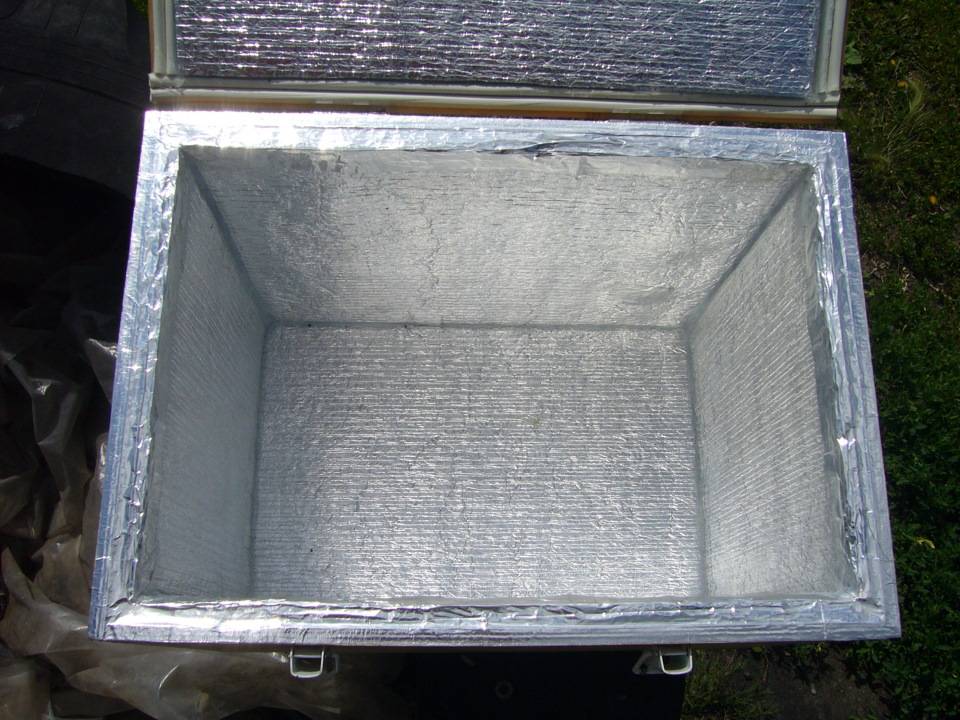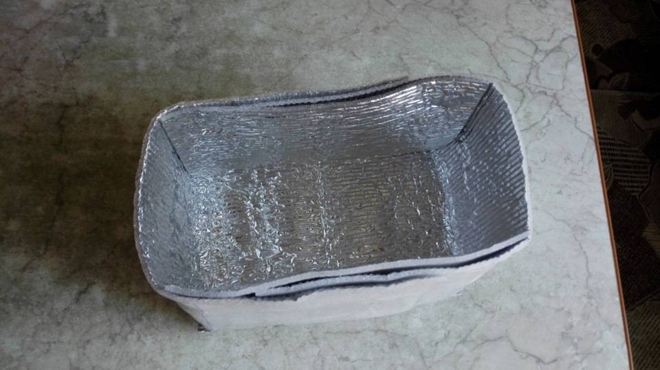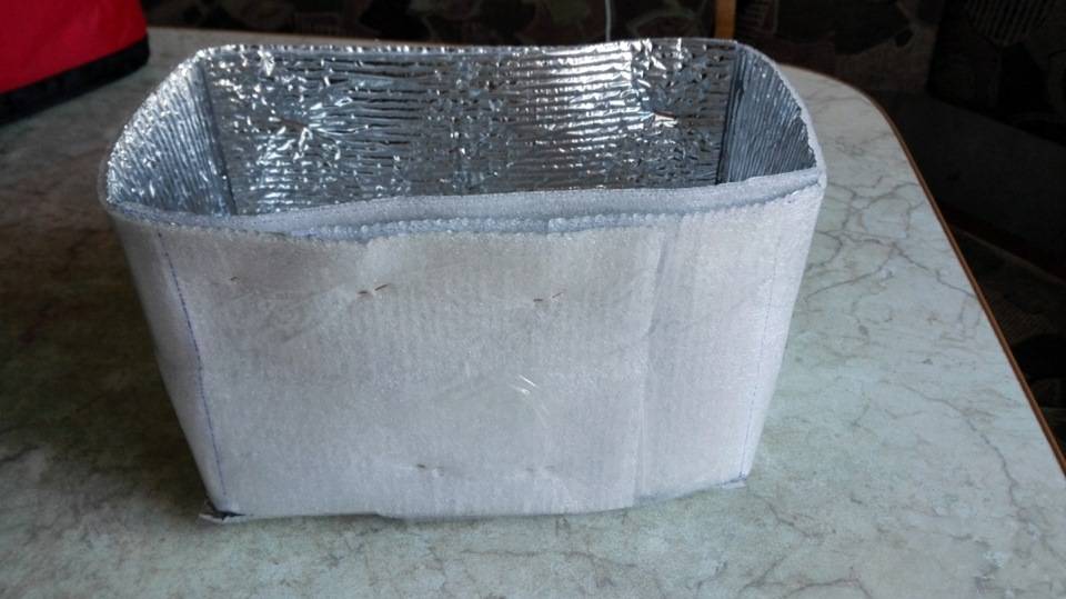 Чтобы сделать «термохранилище» для перевозки продуктов в багажнике авто, вам придется подыскать более объемную основу. Часто для этой цели используют коробку из фанеры или плотного картона. Для усиления термоизоляционных свойств, внутри коробку обкладывают тонким пенопластом, и только потом слоем фольгированного поролона. Последний закрепляют по верхнему периметру коробки при помощи скотча. Такой же подход используется и для изготовления крышки. Ну, а так как просто коробку переносить крайне неудобно, часто для такого «термохранилища» отдельно изготавливают чехол с ручками из прочной ткани.