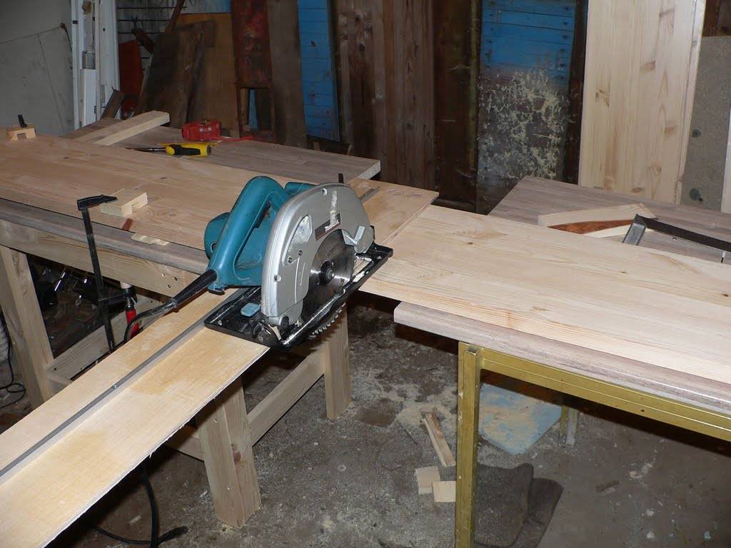 Известно несколько вариантов для изготовления стола циркулярки. Стационарные столы можно пропилить или изготовить из двух частей. Диск циркулярной пилы должен выступать не более, чем на треть от своего диаметра.