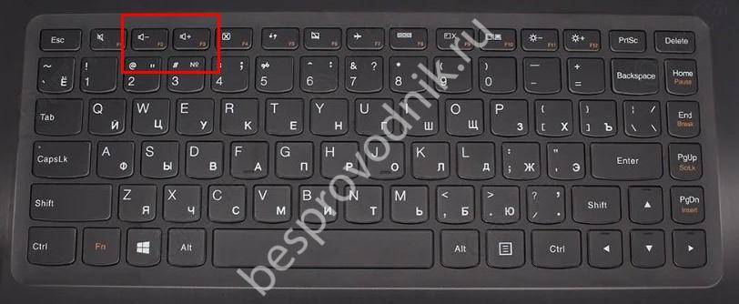 Обратите внимание на функциональную клавишу F (чаще всего F8 или F9, F2 и F3) с нарисованным на ней динамиком. На некоторых моделях, чтобы прибавить или убавить, необходимо нажать на соответствующие клавиши вместе с Fn