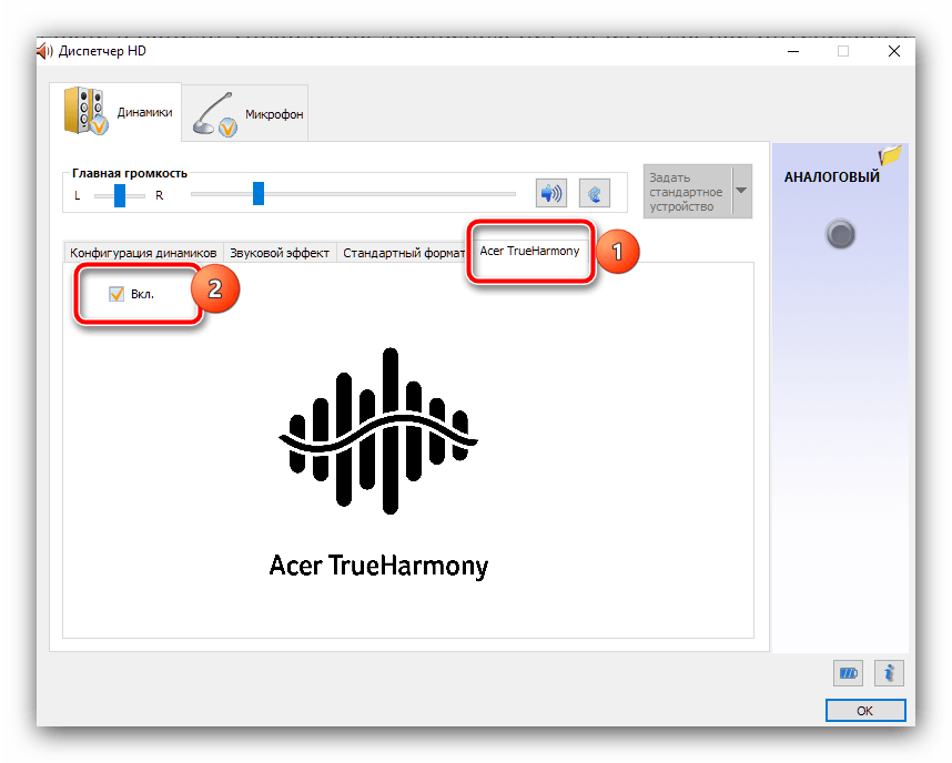 Если же ПО гарантированно новейшее из доступных, следует проверить параметры панели управления драйверов. Покажем это на примере уже упомянутого Realtek HD, но с настройками производителя Acer.