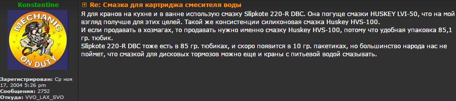 На форуме Huskey некто Konstantine пишет, что смазывает смеситель смазкой Slipkote 220-R DBC: