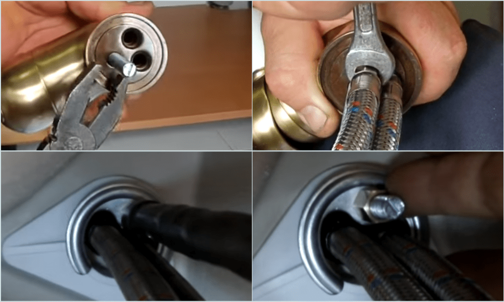 - в нижней части корпуса смесителя откручивают гибкие подводки из выходных отверстий с использованием плоскогубцев;