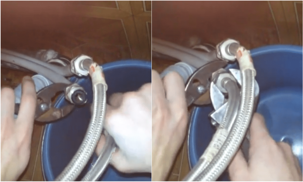 - Найти накидные гайки, соединяющие подводку с магистральными трубами, и открутить при помощи разводного ключа. Для слива остатков воды понадобится тазик.