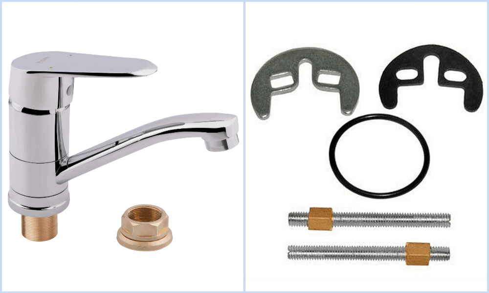 Для сборки приготовьте саму врезную мойку, смеситель с установочным комплектом и гибкую подводку. Установочный комплект входит в комплект смесителя и включает: