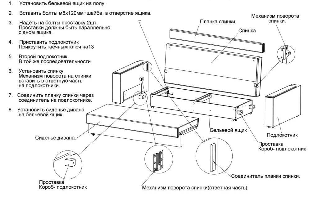 На протяжении всего процесса рекомендуется постоянно сверяться с инструкцией по сборке дивана.