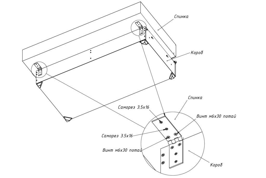 Устанавливаем диван на ящик. Совмещаем пазы механизмов с отверстиями в ящике. Закрепляем конструкцию винтами.