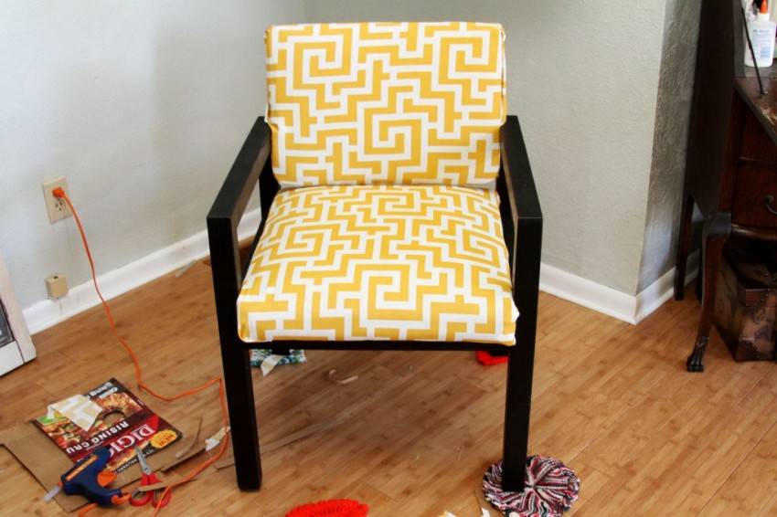 Нам хотелось получить временную мебель, никто не планировал изготавливать кресло на века. Ситчик на подлокотниках, несмотря на хорошую прихватку клеем, со временем облезет. Если немного сказать о конструкции кресла, то оно получилось просто неубиваемое.