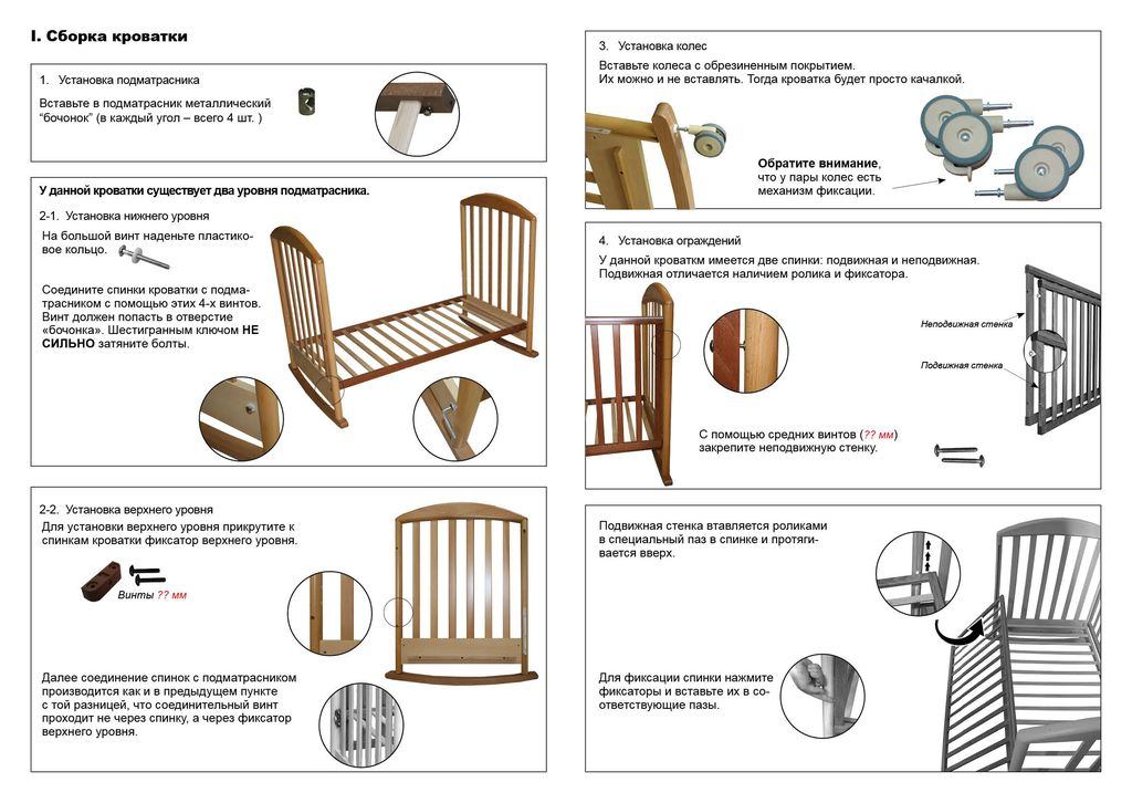 Удостоверьтесь, что имеются все нужные части, болтики и системы работы кроватки.
