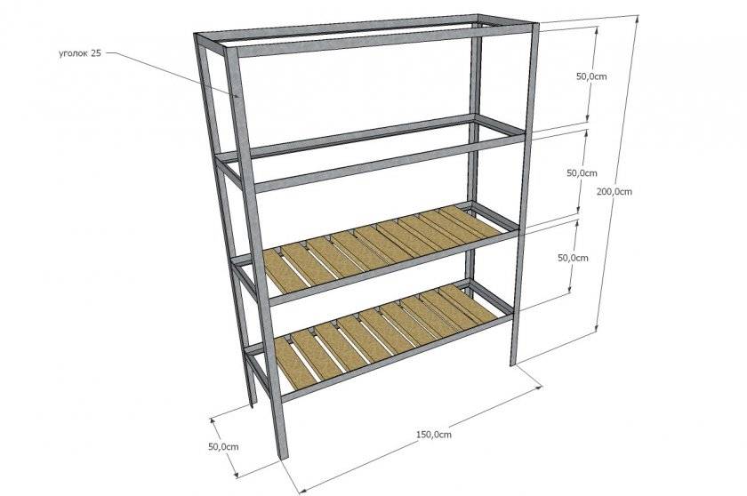 В зависимости от возможностей каркас из профильной трубы собирают на болтах или сваривают. Альтернативный вариант из металлических уголков обойдется дешевле, так как их цена меньше. Для упрощения монтажа делают стеллаж своими руками комбинированным. Вместо трубы для боковых стоек берут металлический уголок.
