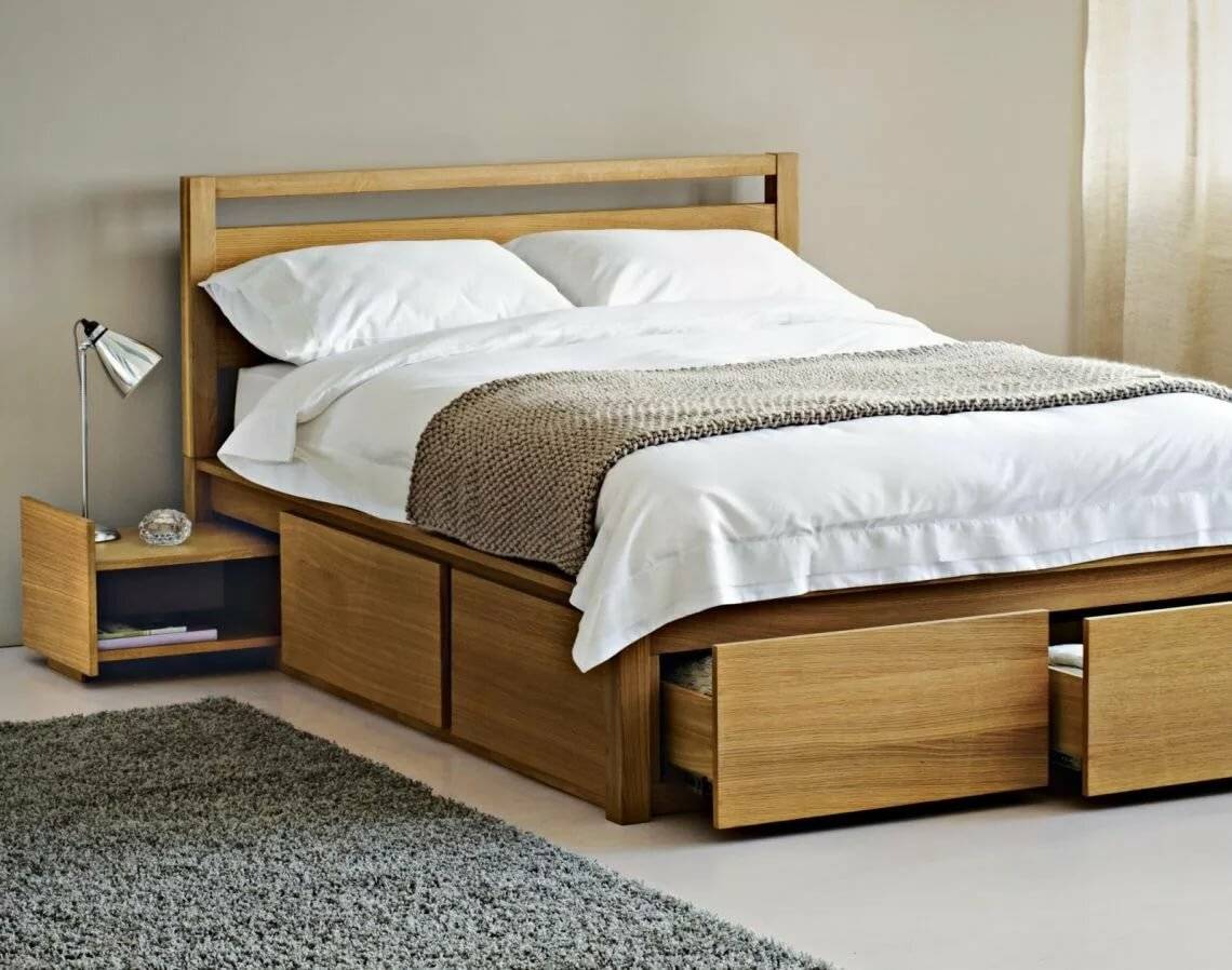 Изготовив кровать своими руками с выдвижными ящиками, вам не нужно ставить шкафы и комоды дополнительно.