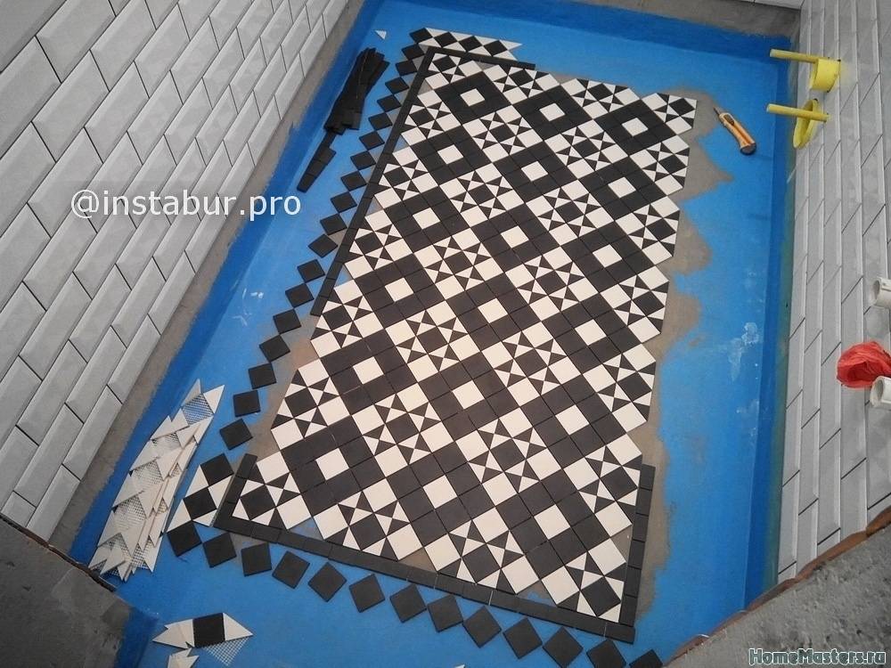 При укладке плитки кабанчик со смещением необходимо подрезать внутренний угол под углом 45 градусов. Таким образом угол будет более аккуратным и красивым.