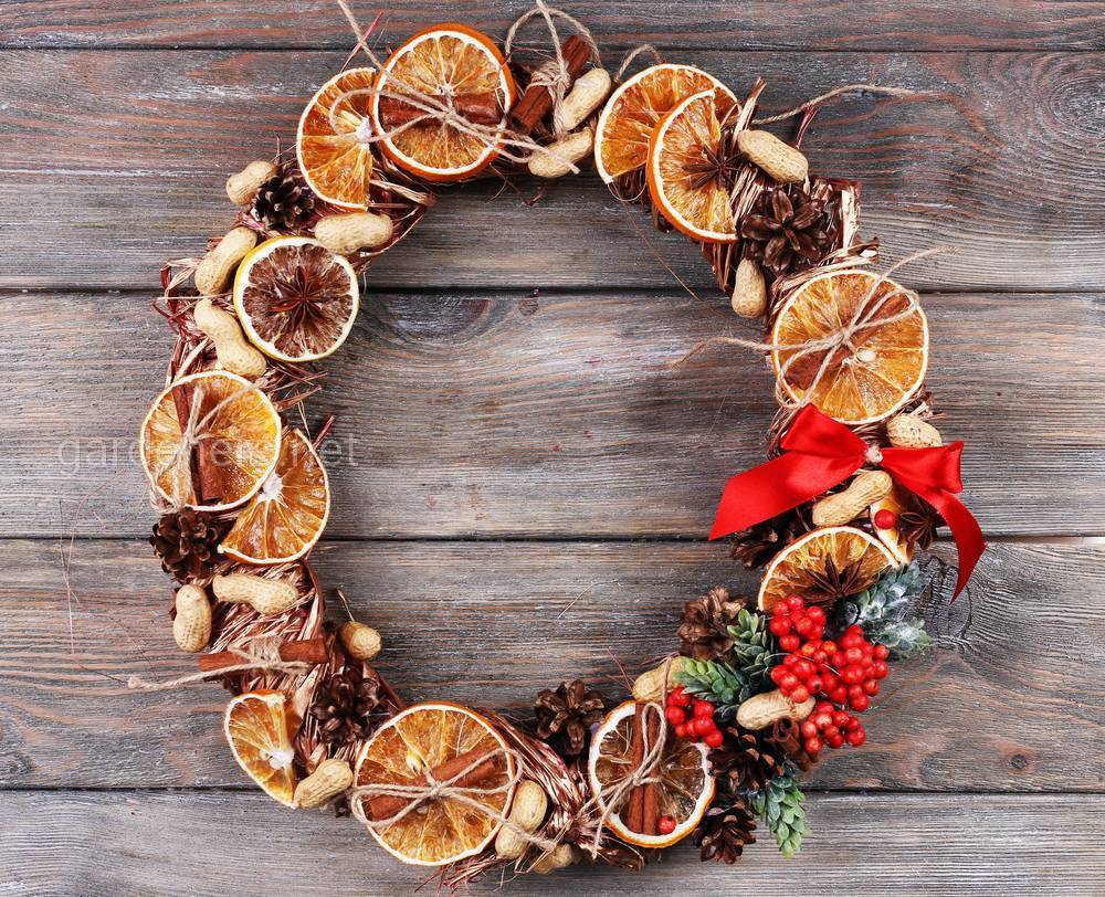 Из цитрусовых фрипсов можно смастерить красивые и ароматные рождественские венки и подсвечники. Также вполне реально сделать шикарную гирлянду, которую можно украсить различными способами — еловыми ветками, шишками, сушеными ягодами шиповника на ветках и так далее.