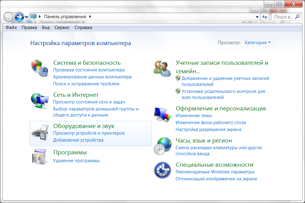 Далее выбрать раздел «Оборудование и звук» , с помощью которого пользователь может добавлять или удалять оборудование, ставить на него различные пакеты драйверов и в частности перенастраивать его функционал.