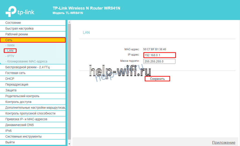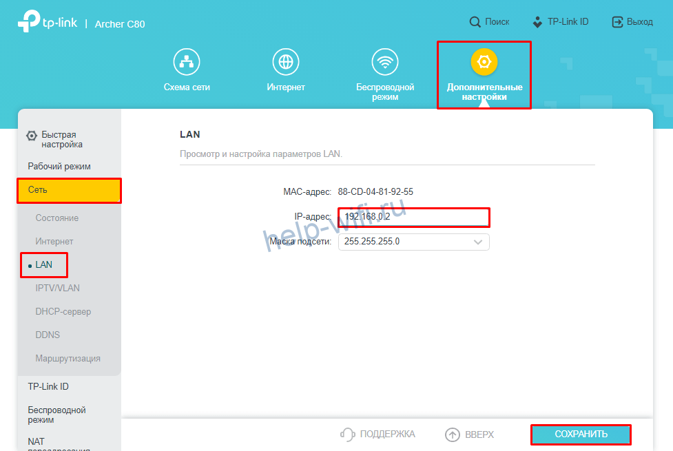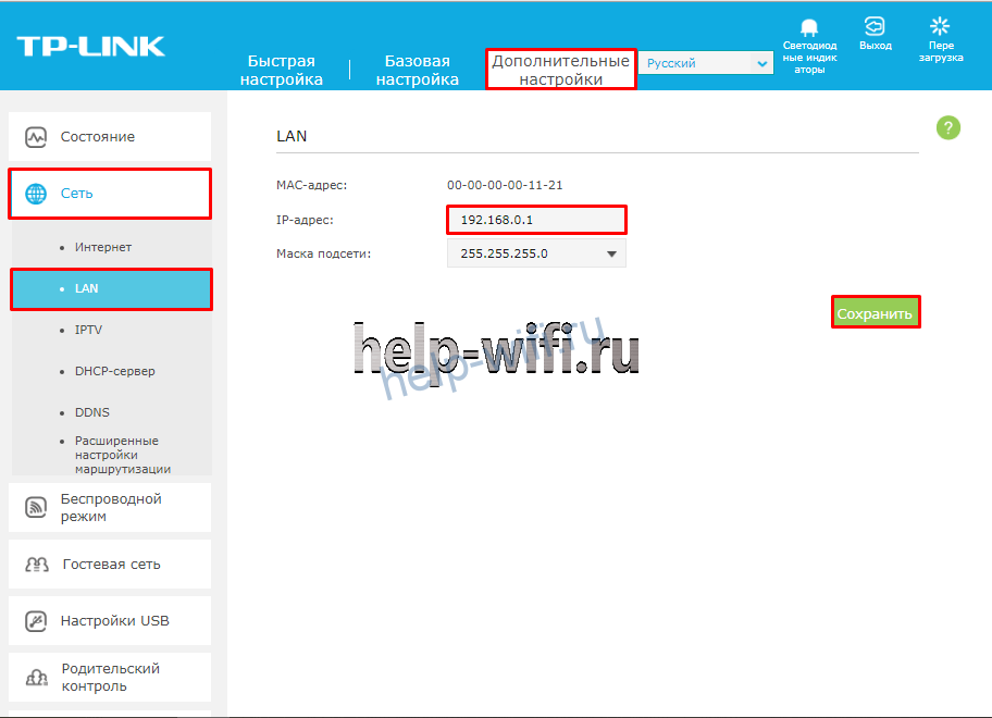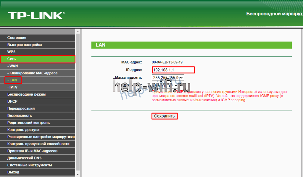 В серо-зеленом интерфейсе для замены айпи адреса вайфай роутера перейдите во вкладку «Сеть», подраздел LAN. Обязательно сохраните изменения.