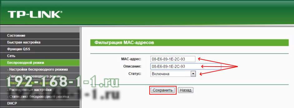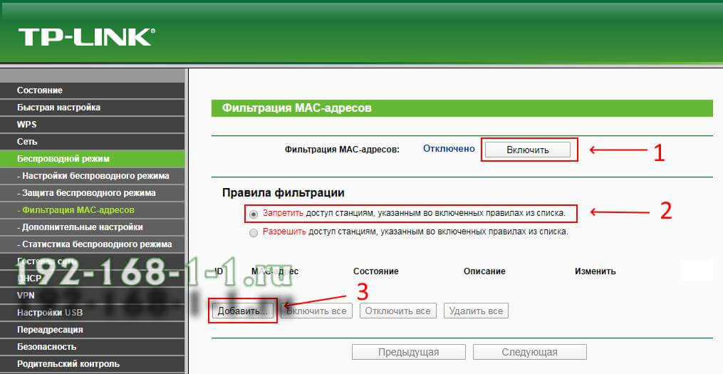 Мы определили все подключенные устройства — отлично! А как быть если одно из них — это злоумышленник, например?! Как отключить пользователя от WiFi так, чтобы не мешать другим?! Тут тоже ничего сложного. Надо просто внести этого пользователя в чёрный список. Покажу опять же на примере TP-Link.
