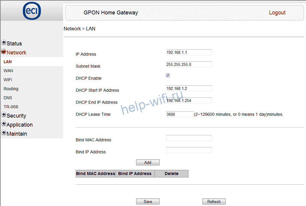 Стандартный адрес Alcatel изменяется в настройках LAN, расположенных в разделе Network.