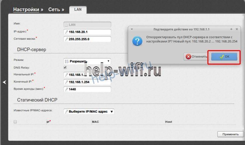 После сохранения нового адреса ПО роутера предложит изменить пул DHCP-сервера. Кликните «Ок».