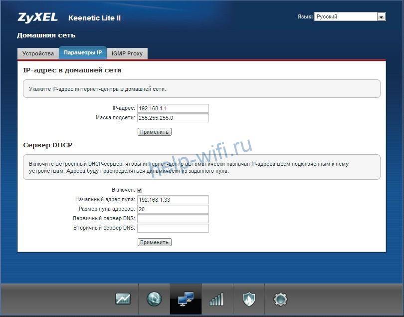 На устройствах ZyXEL настройки LAN находятся во вкладке «Домашняя сеть». Адрес задается в параметрах IP.