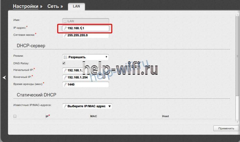 В открывшемся окне найдите поле «IP-адрес» и укажите новое значение. Обязательно в окне нажмите на «Применить».