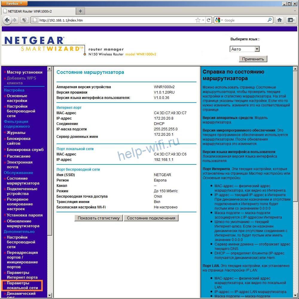 В старой прошивке Netgear параметры локальной сети находятся в разделе «Дополнительно» на главном экране.