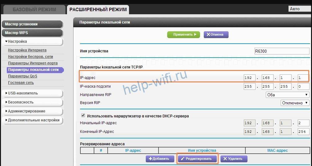 Адрес точки доступа роутера Netgear изменяют, переключив веб-интерфейс в расширенный режим. Необходимо открыть параметры локальной сети, нажать кнопку «Редактировать», а затем изменить IP-адрес. Обязательно нажмите кнопку «Применить» после внесения изменений.