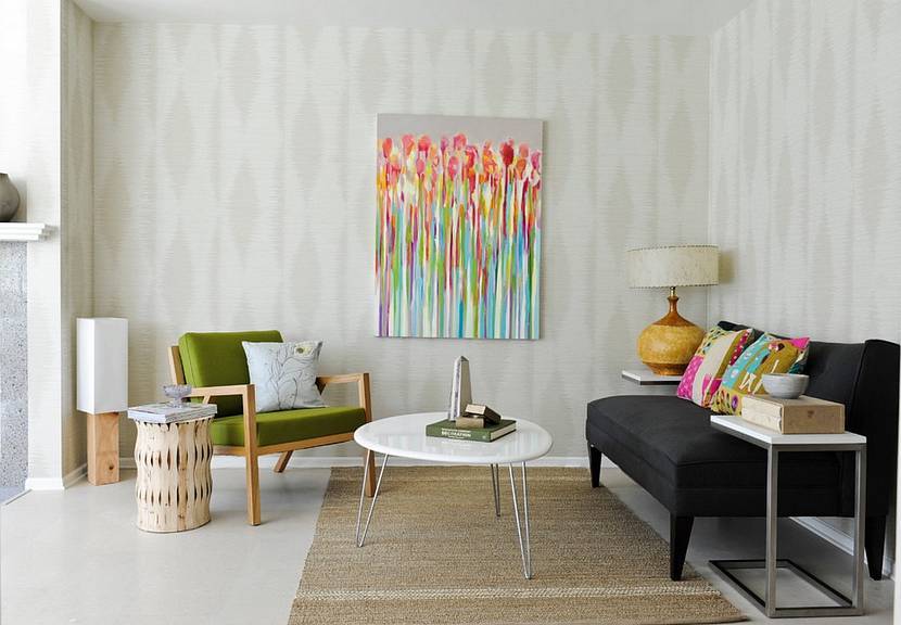 Для тех, кому окрашенное помещение кажется неуютным, есть хорошая новость: визуально увеличить потолок можно и с помощью грамотной оклейки удачно подобранных обоев. Неплохой способ сделать помещение выше – это украсить стены обоями с вертикальным рисунком. Не обязательно, чтобы на них изображались полосы – можно остановиться на геометрических фигурах, растительности и даже выбрать однотонные обои с вертикальной ориентацией фактуры. Если не желаете визуально еще больше уменьшить высоту потолка, то забудьте об обоях со слишком яркими и частыми полосками. Также стоит отмести идею разграничения полосатых стен и однотонного верха широченным потолочным плинтусом. Для разделения можно использовать тонкий плинтус либо вообще обойтись без него, при этом обои завести на потолок. А вот если вы не можете отказаться от сочетания обоев и декоративных панелей, которое не является слишком удачным в низком помещении, то хотя бы не устанавливайте последние таким образом, чтобы они занимали треть стены. Панели следует делать ниже обычной высоты.