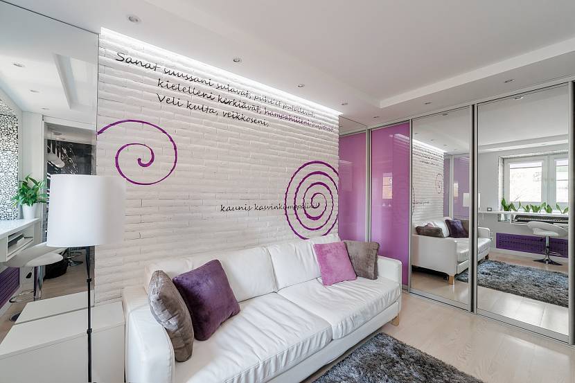 - Попробуйте отказаться от стандартного прямоугольного пространства. Например, подвесной потолок нестандартной формы может изменить внешний вид и расширить узкую комнату. Окраска стен не плоскостями, а фигурными элементами поддержит этот эффект. Но такие сложные варианты оформления лучше доверить профессиональным дизайнерам.
