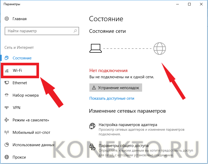 Откроется окно с параметрами сети, где видно, что подключение к Интернету отсутствует. Переходим на вкладку «Wi-Fi».