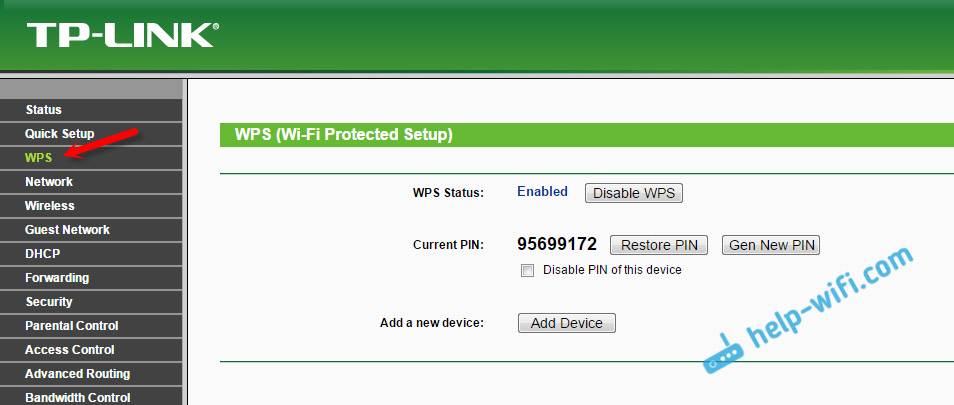 Заходим в настройки маршрутизатора, и переходим на вкладку «WPS». Если не знаете как зайти в панель управления, то смотрите эту инструкцию.