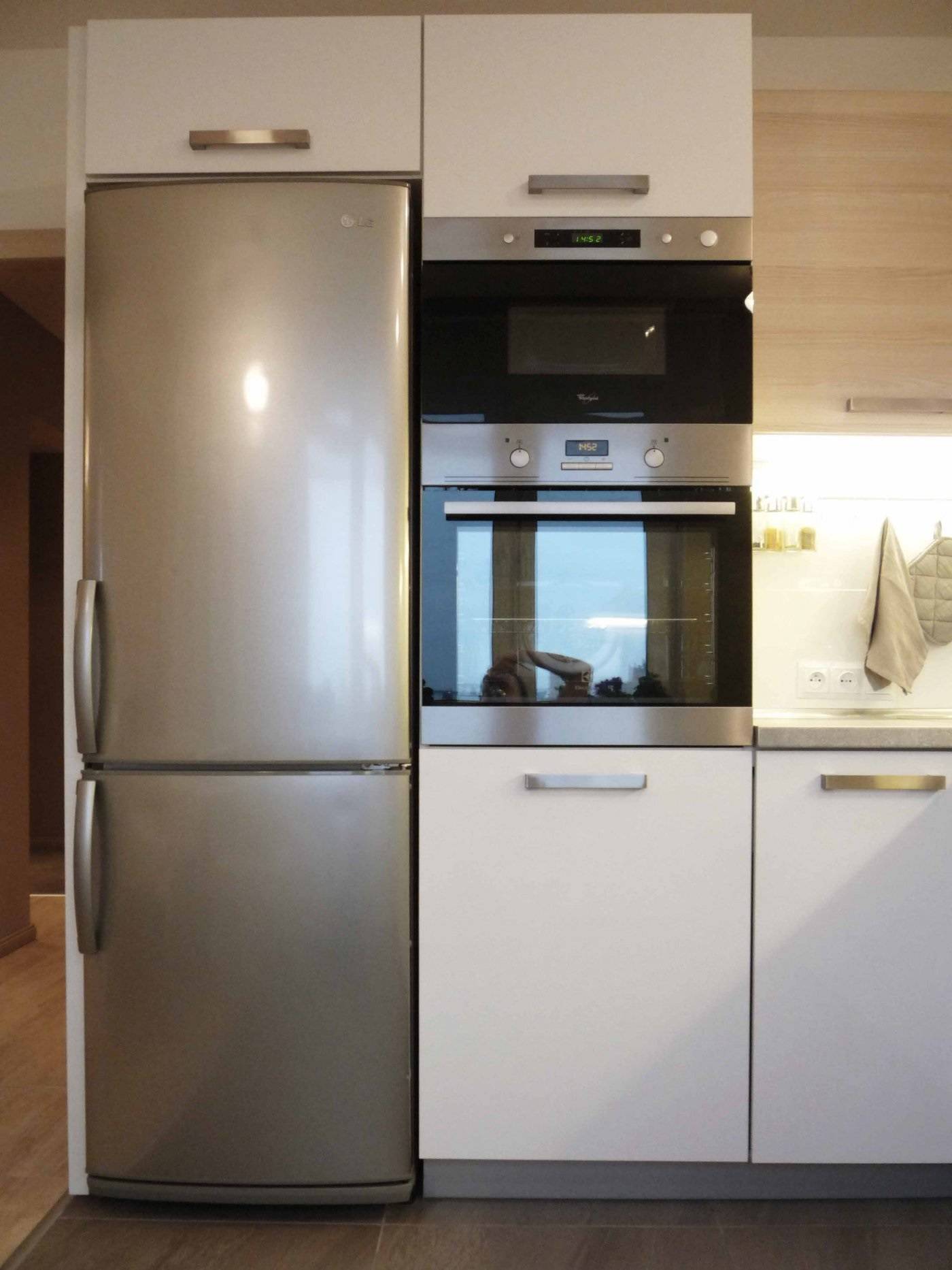 Совет Если есть возможность, дверной проем лучше расширить – пространство визуально увеличится, и холодильник на его фоне будет восприниматься по-иному.