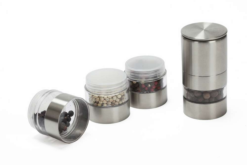 Это комплект, который состоит из механической мельницы и 4 емкостей для пряностей. Контейнеры позволяют правильно организовывать пространство на кухне. Корпус выполнен из металла, а жернова – из керамики. Окошки сделаны из прозрачного пластика и позволяют контролировать количество содержимого внутри.