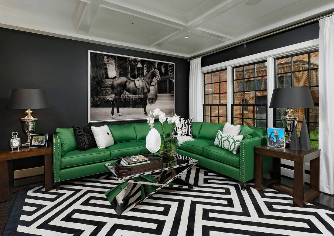Очень оригинально смотрится зелёный диван на фоне мозаики или жёлтой напольной плитки. Для такого интерьера декоративные элементы (ковёр, подушки, шторы) подбираются в зелёном, бирюзовом или синем цвете;