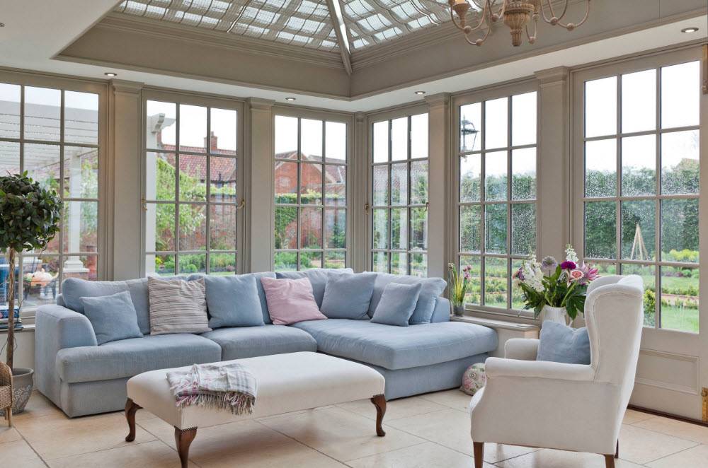 В качестве декора лучше использовать натуральную зелень – домашние растения в горшках. Полупрозрачный белый тюль на большом окне завершит общую картину. Интерьер получится свежим и просторным;