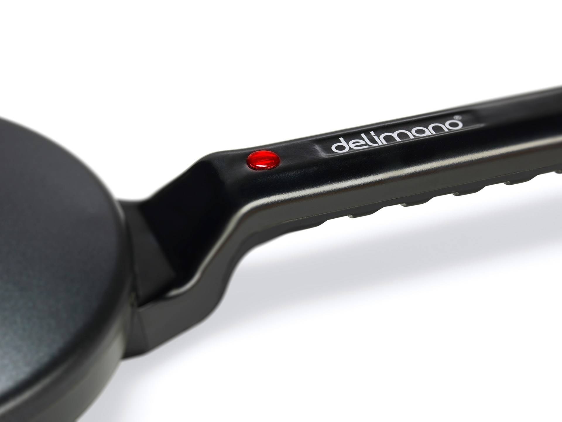 - Delimano Pancake Master. Итальянская блинница черного цвета с экологически чистым, запатентованным в Швейцарии керамическим антипригарным покрытием. Легкая (чуть больше килограмма) и компактная (7 x 20 x 39 см). Подходит для выпекания даже самых тонких блинчиков. Ее особенностью является способность выпекать блинчики с хрустящими краями, как на чугунной сковороде. Единственный минут – зависимость от провода. В комплект входит: удобная емкость для теста, сам прибор и инструкция к нему.