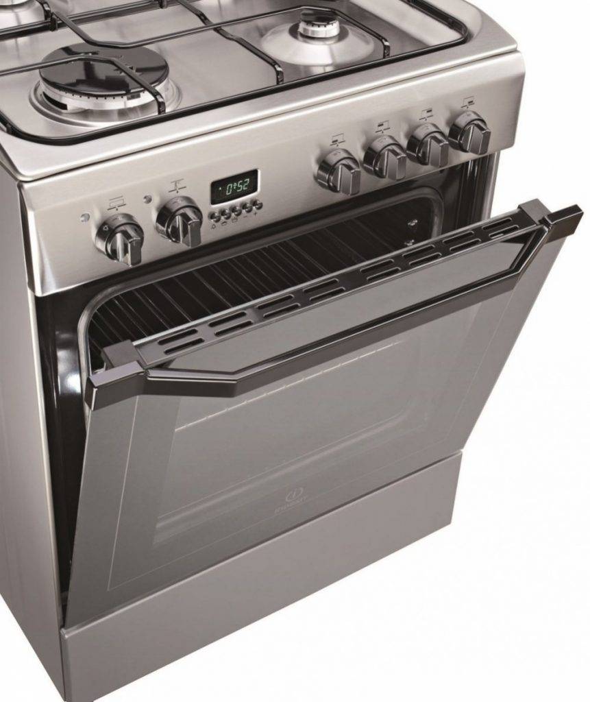 Духовка оснащена грилем с вращающимся вертелом, электрической подсветкой, системой газ-контроля. Панель управления имеет как поворотные переключатели для выбора режима работы конфорок и духовки, так и клавиши для установки электронного таймера.
