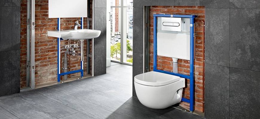 Если владелец хочет установить популярные унитазы подвесного типа либо биде, потребуется также монтировать специальную конструкцию – инсталляцию. Она выполняет следующие функции: