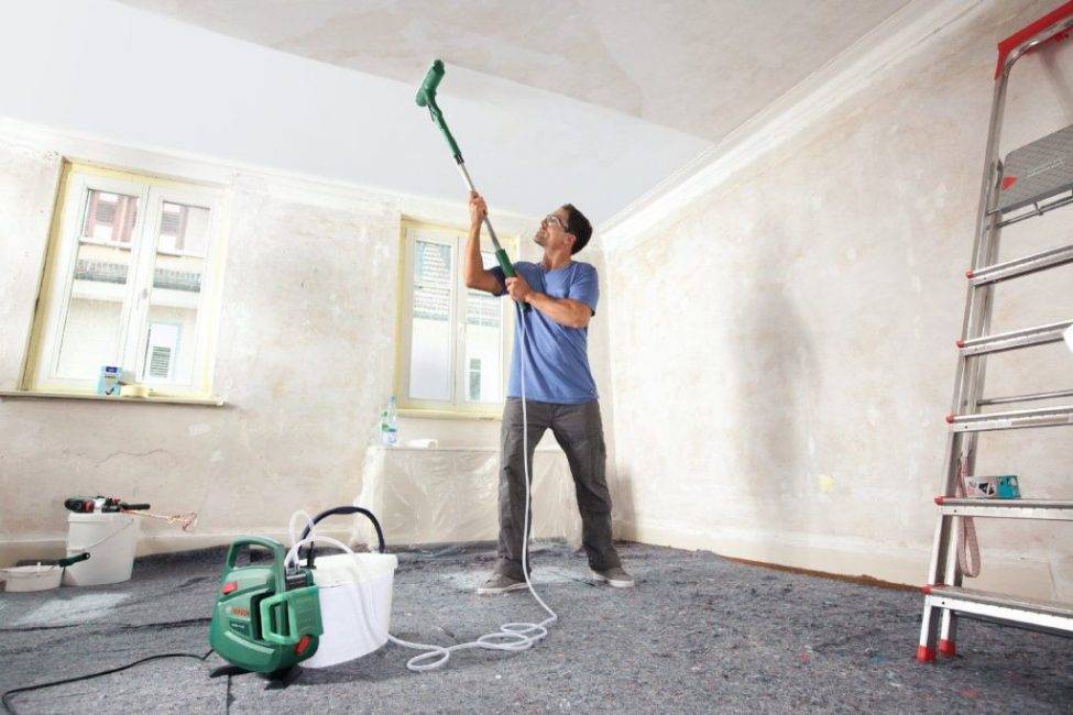 Сначала нужно освободить помещение от мебели и других посторонних предметов. Если планируется только косметический ремонт, покраска одного потолка, тогда стены следует закрыть защитной пленкой, чтоб защитить стены от попадания красящей эмульсии.