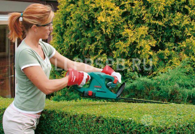 По мнению специалистов, лучшие модели кусторезов для садовых участков площадью от 2 до 6 соток – электрические. Их мощность колеблется от 500 до 700 Вт, что позволяет срезать ветки толщиной до 25 мм. Но прежде чем приобрести электрический инструмент, надо помнить, что он привязан к розетке. Работать можно будет в том месте, куда достанет шнур, хотя можно воспользоваться удлинителем. При использовании электричества на улице обязательный элемент безопасности – это устройство защитного отключения. Механизм при обрыве кабеля при стрижке либо неисправности сразу отключит прибор. Электрическим кусторезом очень удобно стричь кусты и деревья, растущие рядом или густо.