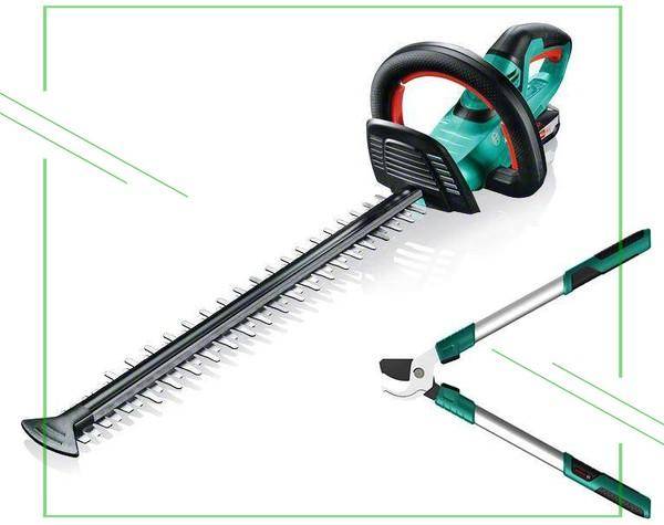 Аккумуляторные кусторезные ножницы для работ по состриганию живых изгородей и декоративных кустарников. Эргономичная рукоятка и удобный элемент пуска. Улучшенная конфигурация лезвий предоставляет эффектный и четкий рез. Предохранительная функция ножей защищает от обратного действия при проведении стрижек близко от поверхности земли. Имеет систему блокировки ножей. Средняя цена: от 7400 рублей.