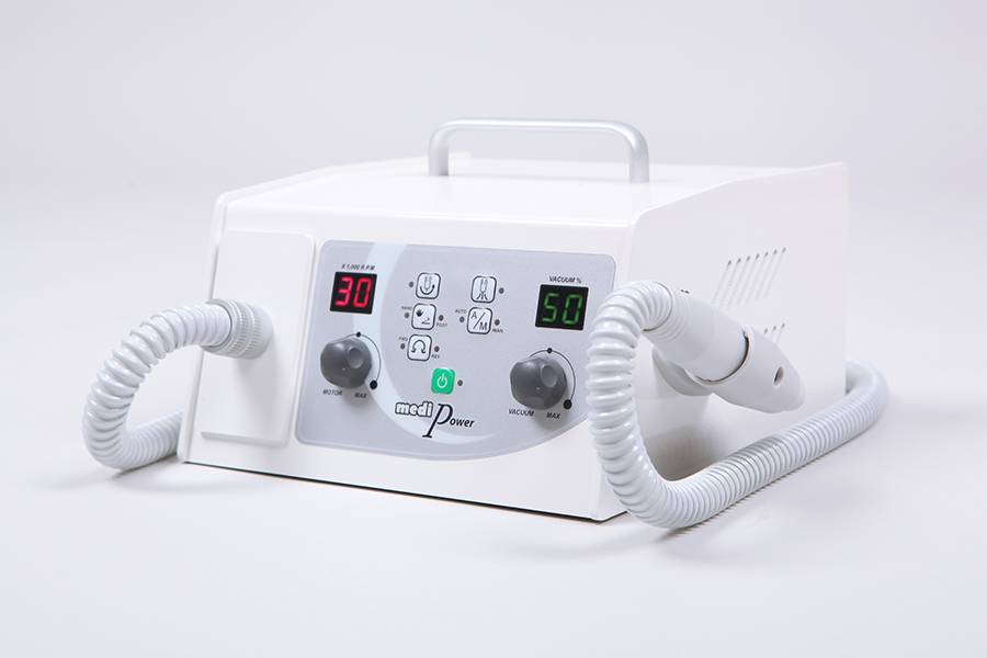 Оптимальный аппарат для педикюра, хотя некоторые применяют его для маникюра. На 2 дисплеях показываются такие параметры, как скорость вращения фрезы и всасывания пыли пылесосом.