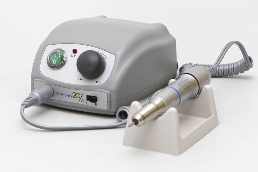 Ручка прибора очень легкая. Скорость показывается на небольшом мониторе. Фрезер идет в комплекте с педалью. Наконечник содержит углеродные щетки, что обуславливает его долговечность.