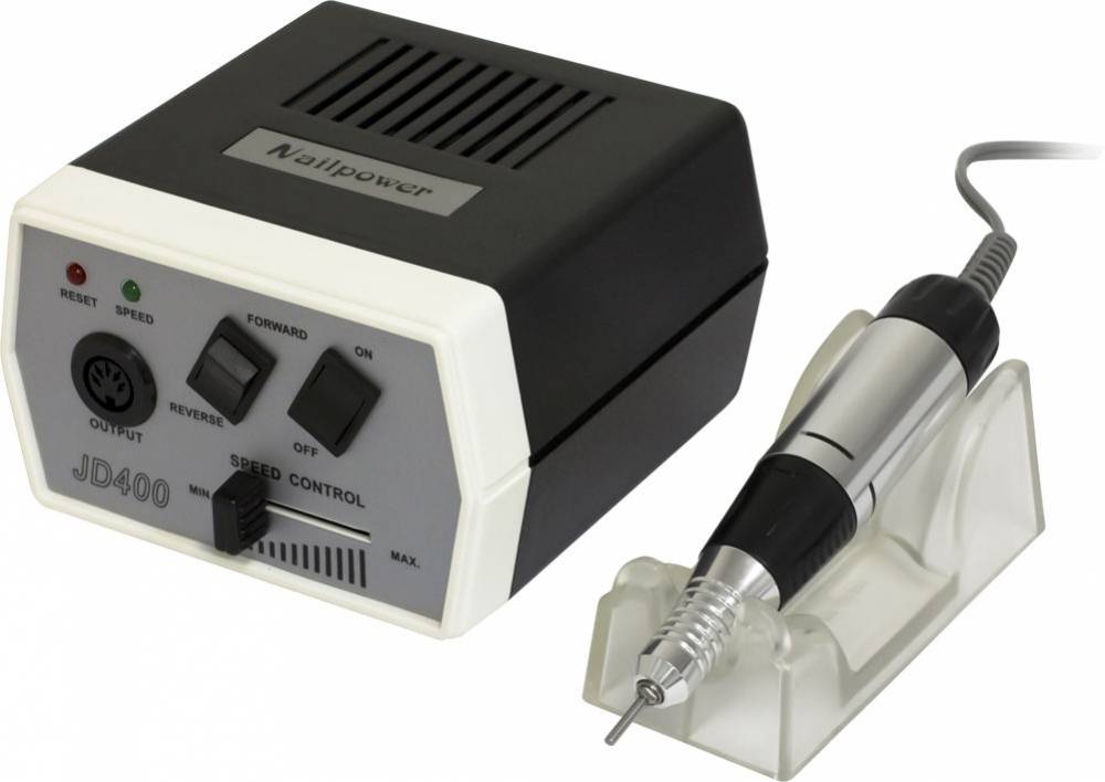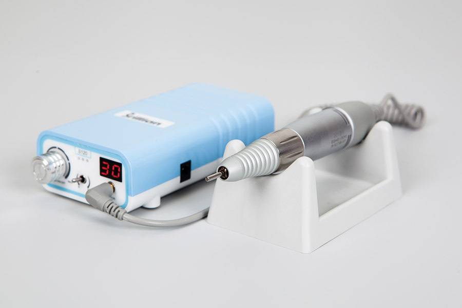 Устройство оснащено круглым регулятором скорости вращения фрез и предохранителем, чтобы избежать перегрева. Максимальное количество оборотов — 20000. Удобная ручка не вибрирует и помещается на подставку. Аппарат не предназначен для педикюра.