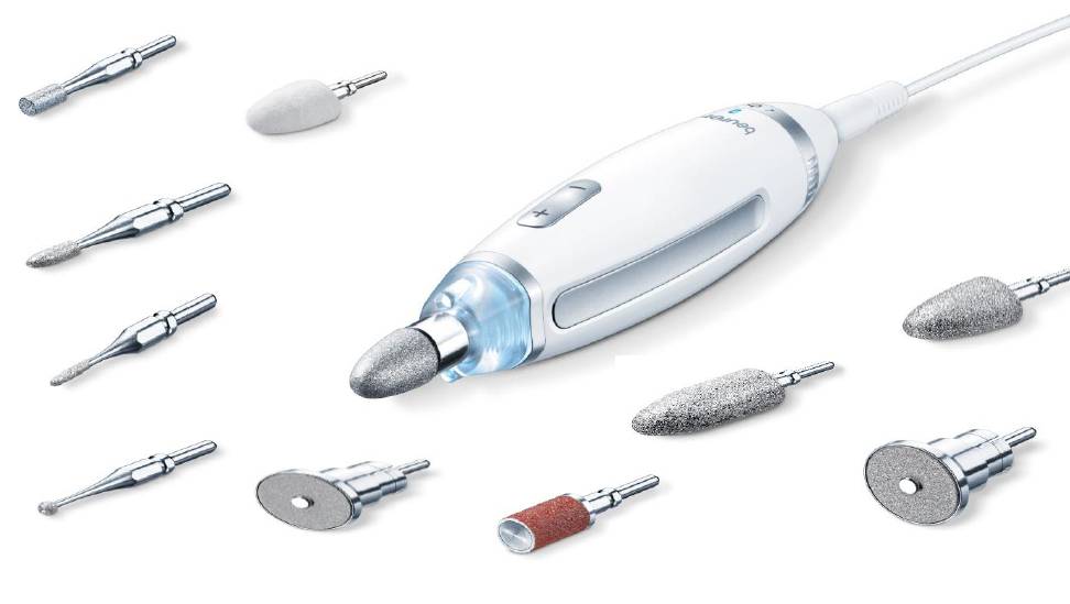 Ключевая особенность прибора — 10 насадок с сапфировым напылением в комплекте. Скорость регулируется двумя кнопками. Фрезер помещается в небольшую сумку и еще содержит колпачок, чтобы собирать пыль. Когда машинка работает, на ней горит лампа.