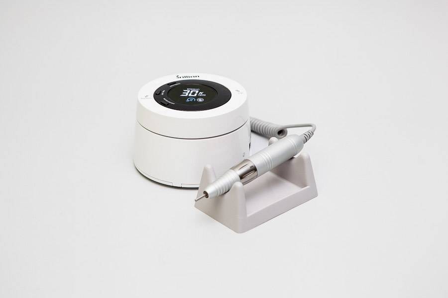 Устройство применяется для работы с разными типами ногтей. Ключевые особенности — встроенный сенсорный держатель для ручки, реверс, ЖК-дисплей, цанговый зажим.