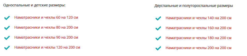 Получив необходимые знания о видах чехлов, нужно ознакомиться и с его размерами. Какие бывают размеры изделий? Для этого необходимо выполнить три основные действия ─ измерить длину, ширину и толщину матраса. Только правильно подобранный размер наматрасника, доставит взрослому человеку или ребенку комфортное ощущение во время ночного сна. Рассмотрим основные размеры наматрасников (см):