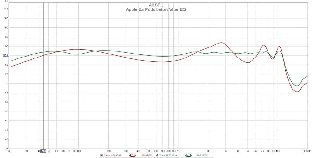 С басами и нижней частью середины полный порядок, а вот верхняя часть средних частот и ноты верхнего регистра после 10кГц подкачали. Возможно, это сделано для улучшения слышимости при разговорах, поскольку Apple EarPod – это в первую очередь гарнитура, а не наушники для меломанов.