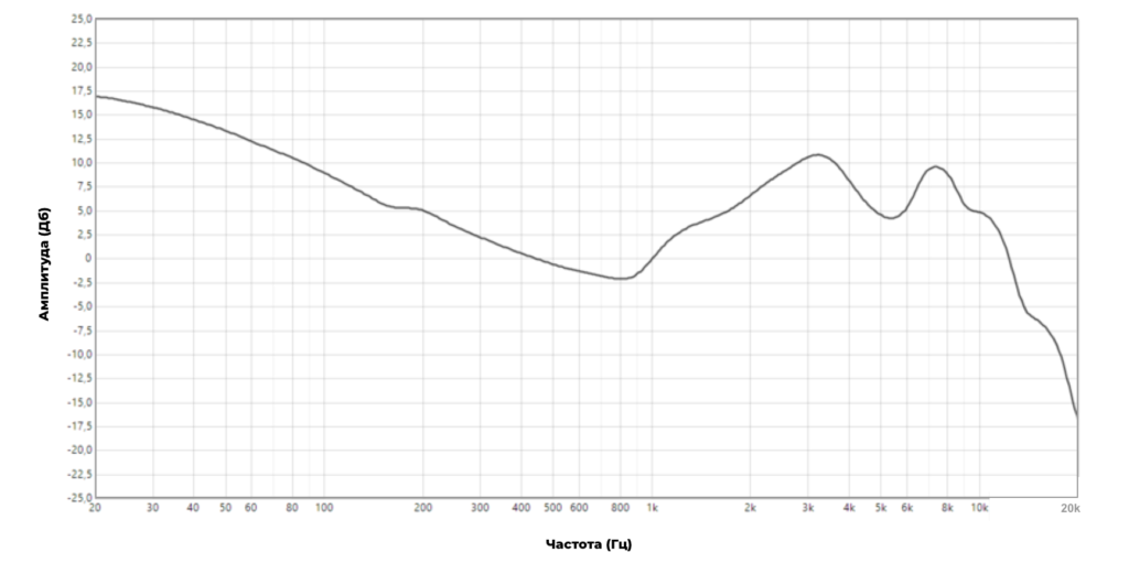На графике АЧХ видно, что в нижнем диапазоне уклон сделан в сторону среднего баса, но НЧ не доминируют. Качество ВЧ типично для наушников бюджетного ценового сегмента, поэтому насладиться мельчайшими нюансами звучания вряд ли получится, но при использовании компактных беспроводных моделей это маловероятно
