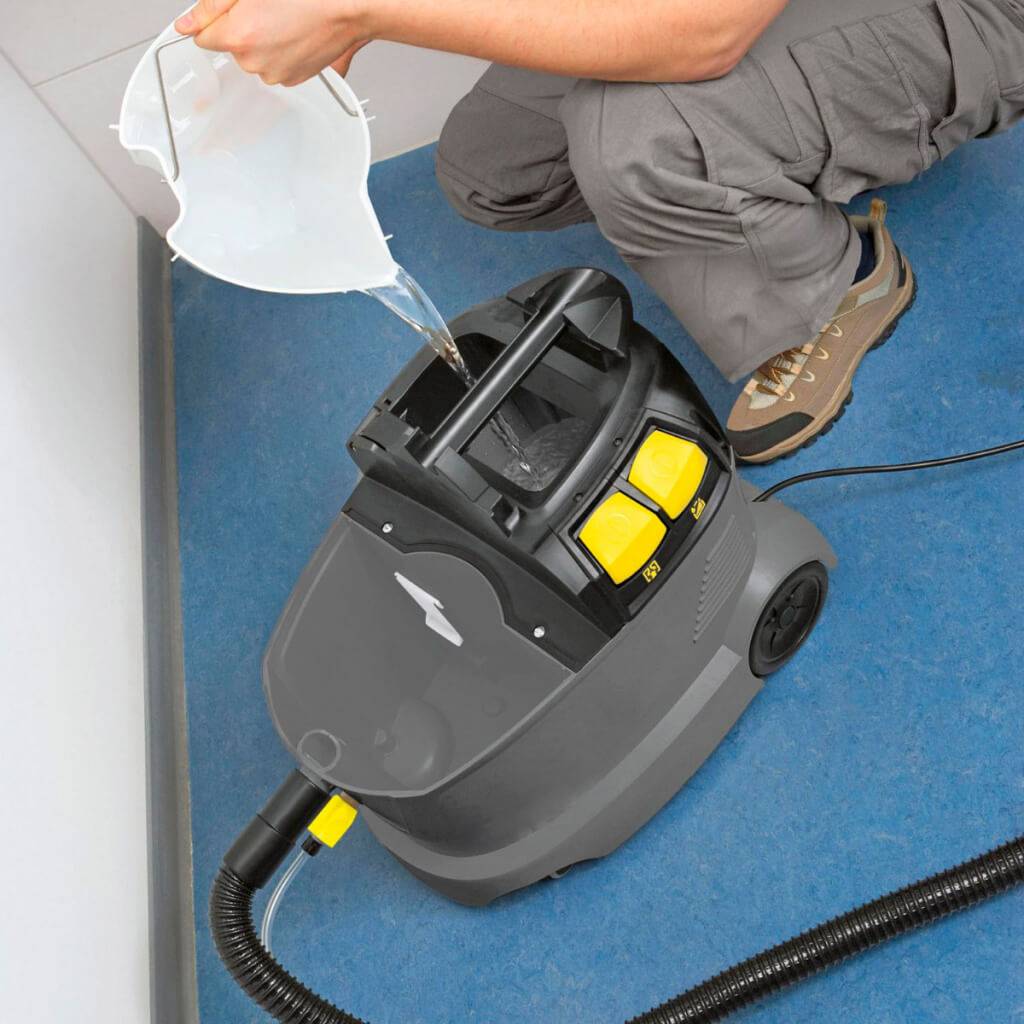 Удобнее, когда используется конструкция “бак в баке” — грязная вода находится в нижней части корпуса, резервуар отстегивается нажатием боковых защелок.