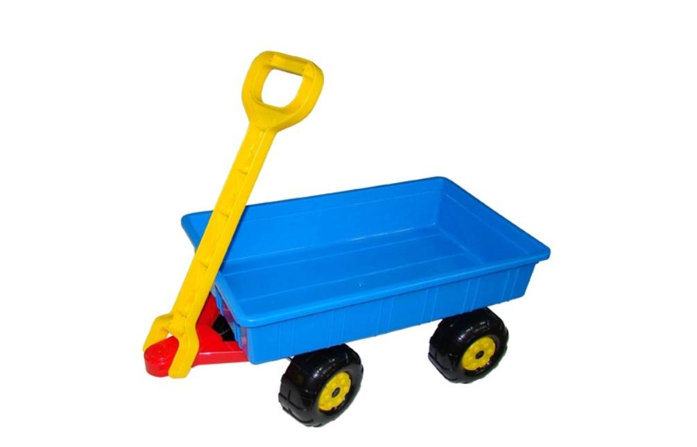 Крепкая и устойчивая дачная тележка с широким пластиковым колесом и толстыми опорными ножками подойдет даже для самых маленьких помощников.